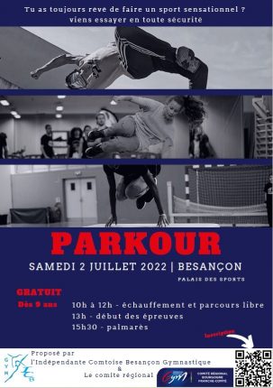 Evénement Parkour Samedi 2 juillet 2022 au palais des sports de Besançon Un grand merci à tous les bénévoles présents pour l’organisation de cette manifestation. Un grand merci au comité régional Bourgogne Franche-Comté de gymnastique ainsi qu’à la ville de Besançon !