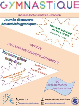 Pendant les vacances d’été, le club de l’ICB Gym vous propose deux après-midi découverte :Activités gymniques (gym aux agrès, aérobic, gym acrobatique, teamgym, trampoline)Parcours géant Baby-GymL’inscription se fera sur place le jour-même.Pour la Baby-Gym, l’accès sera libre sur les horaires indiqués, pour la découverte des activités gymniques, accueil à 14h-14h30 et activités jusqu’à 17h30.